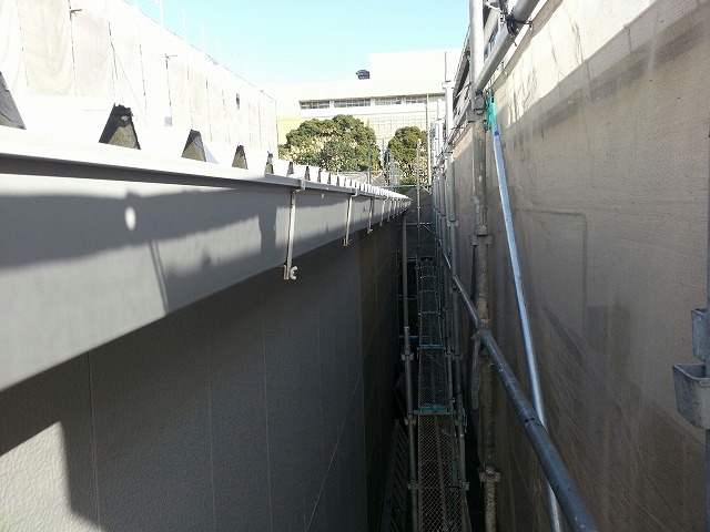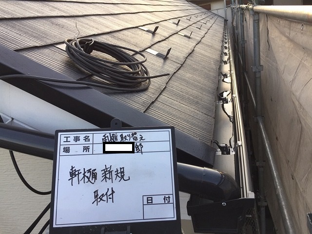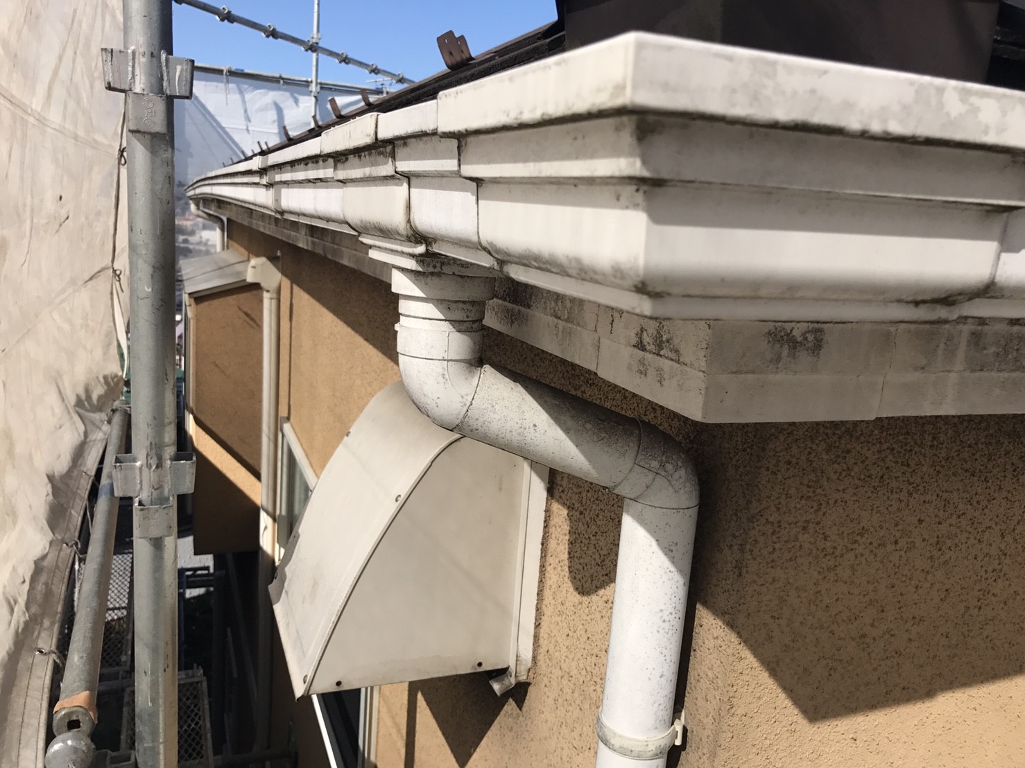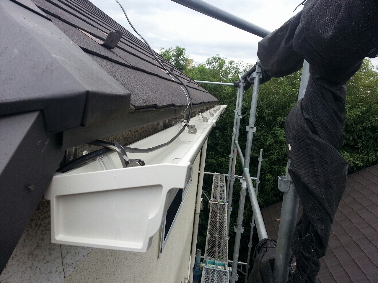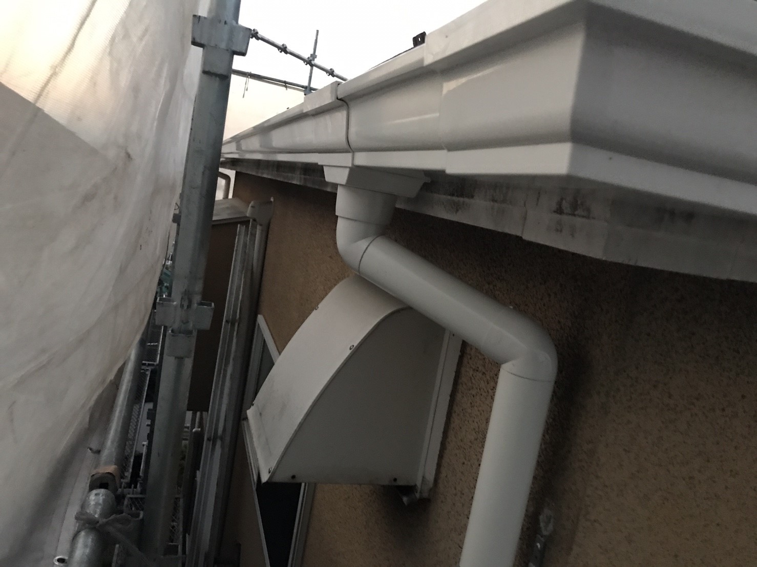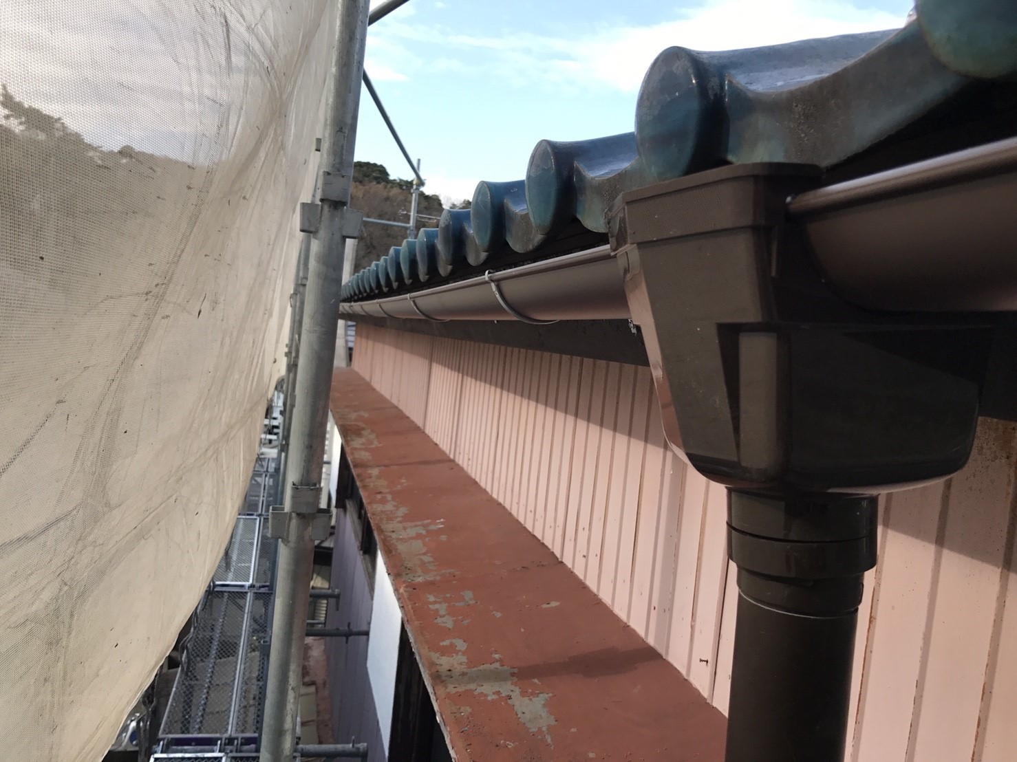 工事内容:仮設足場設置既設軒樋(金物含む)・既設竪樋(金物含む)撤去新規軒樋(金物含む)・新規竪樋(金物含む)・新規集水器取り付け仮設足場解体完工