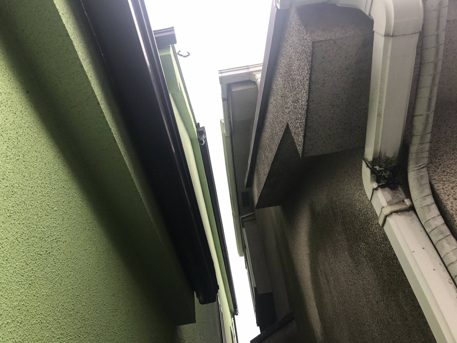 まず梯子を使い状況を確認してから、。雨どい(雨樋)の故障個所を調べていきます。