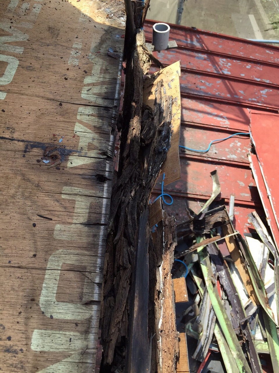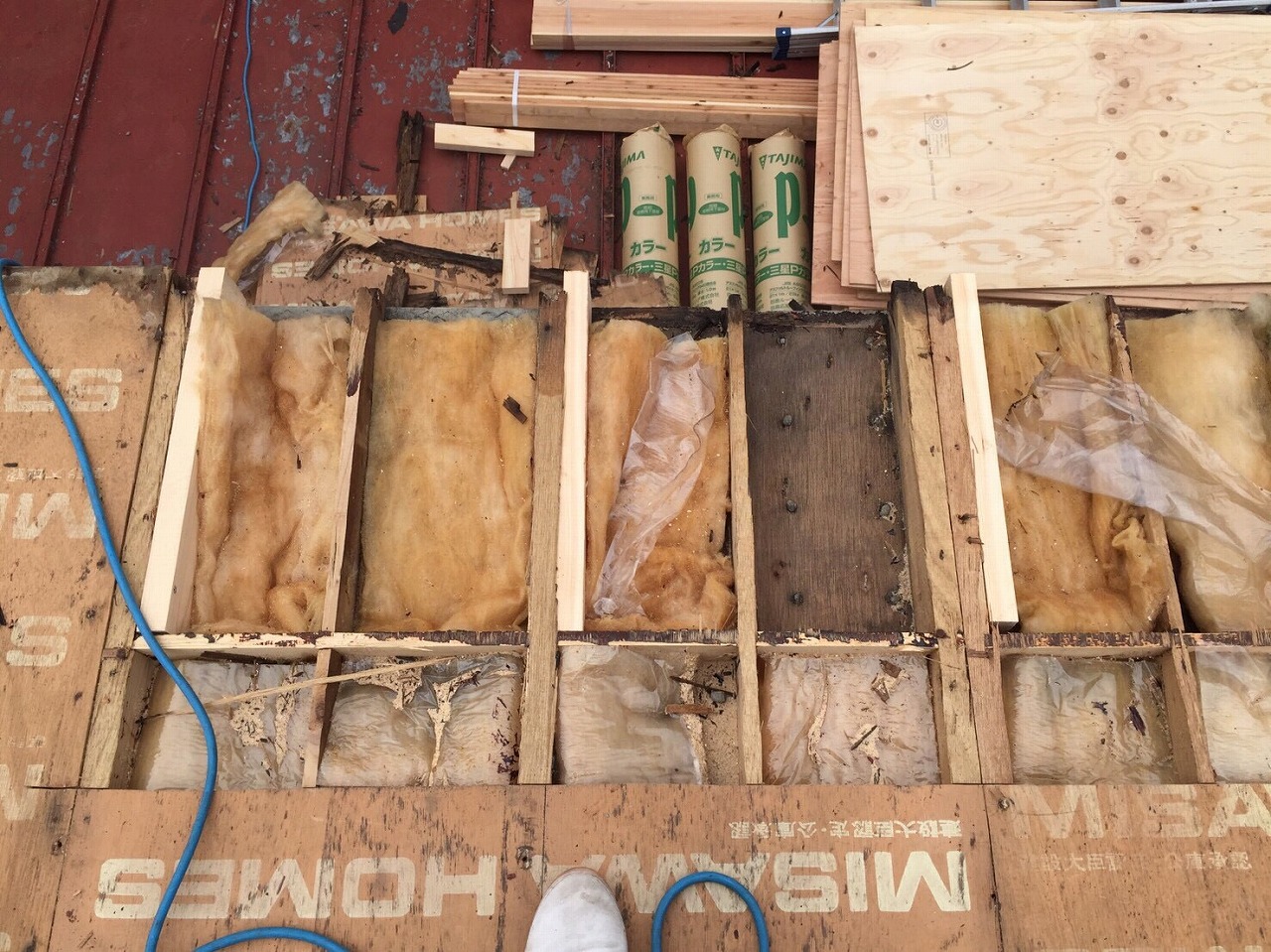 ②屋根を開けてみると、下地が腐っており、断熱材まで雨漏りした形跡があります。