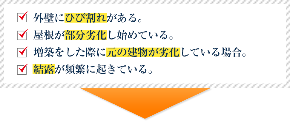 まず一番多いものは、外装、屋根の劣化から雨漏りにつながることが非常に多く見受けられます。