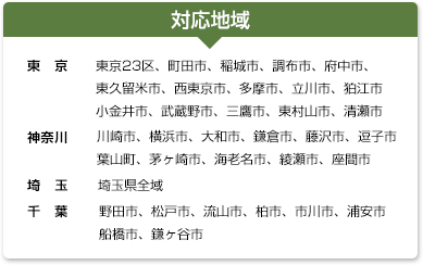 | 対応地域 | ・東京都 昭島市/あきる野市/足立区/荒川区/板橋区/稲城市/江戸川区/青梅市/江戸川区/青梅市/大田区/葛飾区/北区/清瀬市/国立市/江東区/小金井市/国分寺市/小平市/狛江市/品川区/渋谷区/新宿区/杉並区/墨田区/世田谷区/台東区/立川市/多摩市/中央区/調布市/千代田区/豊島区/中野区/奥多摩/西東京市/練馬区/八王子市/羽村市/東久留米市/東村山市/東大和市/日野市/府中市/福生市/文京区/町田市/三鷹市/港区/武蔵村山市/武蔵野市/目黒区 ・神奈川県 愛甲郡愛川町 愛甲郡清川村 足柄上郡大井町 足柄上郡開成町 足柄上郡中井町 足柄上郡松田町 足柄上郡山北町 足柄下郡箱根町 足柄下郡真鶴町 足柄下郡湯河原町 厚木市 綾瀬市 伊勢原市 海老名市 小田原市 鎌倉市 川崎市 川崎市麻生区 川崎市川崎区 川崎市幸区 川崎市高津区 川崎市多摩区 川崎市中原区 川崎市宮前区 高座郡寒川町 相模原市 相模原市中央区 相模原市緑区 相模原市南区 座間市 逗子市 茅ヶ崎市 中郡大磯町 中郡二宮町 秦野市 平塚市 藤沢市 三浦郡葉山町 三浦市 南足柄氏 大和市 横須賀市 横浜市 青葉区 旭区 泉区 磯子区 神奈川区 神奈川区 金沢区 港南区 港北区 栄区 瀬谷区 都筑区 鶴見区 戸塚区 中区 西区 保土ヶ谷区 緑区 南区 ・埼玉県 上尾市 朝霞市 入間郡越生町 三芳町 毛呂山町 入間市 大里郡寄居町 桶川市 春日部市 加須市 川口市 川越市 北足立郡伊奈町 北葛飾郡杉戸町 松伏町 北本市 行田市 久喜市 熊谷市 鴻巣市 越谷市 児玉郡上川町 上里町 美里町 幸手市 さいたま市岩槻区 浦和区 大宮区 北区 桜区 中央区 西区 緑区 南区 見沼区 坂戸市 狭山市 志木市 白岡市 草加市 秩父郡小鹿野町 長瀞町 秩父村 皆野町 横瀬町 秩父市 鶴ヶ島市 所沢市 戸田市 新座市 蓮田市 羽生市 飯能市 東松山市 比企郡小川町 川島町 ときがわ町 滑川町 鳩山町 吉見町 嵐山町 日高市 深谷市 富士見市 ふじみ野市 本庄市 三郷市 南埼玉郡宮代町 八潮市 吉川市 和光市 蕨市 ・千葉県 旭市 我孫子市 安房郡鋸南町 夷隅郡大多喜町 夷隅郡御宿町 いすみ市 市川市 市原市 印西市 印旛郡酒々井町 浦和市 大網白里市 柏市 勝浦市 香取郡神崎町 香取郡多古町 香取郡東庄町 香取市 鎌ケ谷市 鴨川市 木更津市 君津市 佐倉市 山武郡九十九里町 山武郡芝山町 山武郡横芝光町 山武市 白井市 匝瑳市 袖ケ浦市 館山市 千葉市 稲毛区 中央区 花見川区 緑区 美浜区 若葉区 銚子市 長生郡長柄町 白子町 長生村 長南町 長柄町 睦沢町 東金市 富里市 流山市 習志野市 成田市 野田市 富津市 船橋市 松戸市 南房総市 茂原市 八街市 八千代市 四街道市 |
