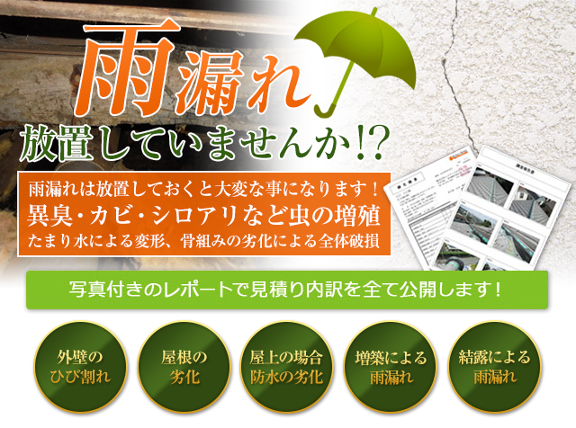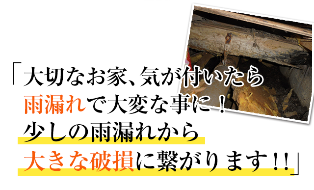 住宅の老朽化などで「しょうがない」と見逃しがちな外装のひび割れ・屋根、屋上部分の劣化などの原因によるあま漏れ。又は増築部分による雨漏り・結露による雨漏りなどのお客様からのご相談を今までに多数いただきました。