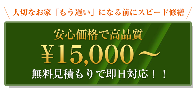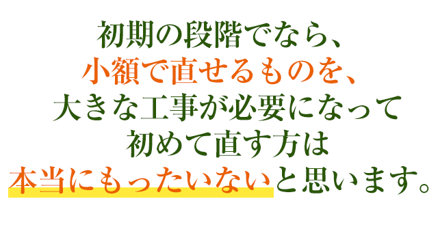 少しでも早く修繕する事で他箇所への浸食を防ぎ大きな住宅工事に発展する事を防ぐ事が出来ます。
