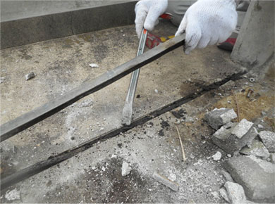 | 1 | 高圧バイオ洗浄 | 2 | 下地調整目地撤去 | 3 | クラック調整 | 4 | ブロア清掃 |