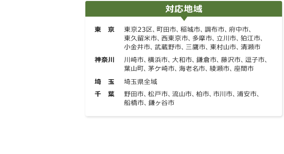 | 対応地域 | ・東京都 昭島市/あきる野市/足立区/荒川区/板橋区/稲城市/江戸川区/青梅市/江戸川区/青梅市/大田区/葛飾区/北区/清瀬市/国立市/江東区/小金井市/国分寺市/小平市/狛江市/品川区/渋谷区/新宿区/杉並区/墨田区/世田谷区/台東区/立川市/多摩市/中央区/調布市/千代田区/豊島区/中野区/奥多摩/西東京市/練馬区/八王子市/羽村市/東久留米市/東村山市/東大和市/日野市/府中市/福生市/文京区/町田市/三鷹市/港区/武蔵村山市/武蔵野市/目黒区 ・神奈川県 愛甲郡愛川町 愛甲郡清川村 足柄上郡大井町 足柄上郡開成町 足柄上郡中井町 足柄上郡松田町 足柄上郡山北町 足柄下郡箱根町 足柄下郡真鶴町 足柄下郡湯河原町 厚木市 綾瀬市 伊勢原市 海老名市 小田原市 鎌倉市 川崎市 川崎市麻生区 川崎市川崎区 川崎市幸区 川崎市高津区 川崎市多摩区 川崎市中原区 川崎市宮前区 高座郡寒川町 相模原市 相模原市中央区 相模原市緑区 相模原市南区 座間市 逗子市 茅ヶ崎市 中郡大磯町 中郡二宮町 秦野市 平塚市 藤沢市 三浦郡葉山町 三浦市 南足柄氏 大和市 横須賀市 横浜市 青葉区 旭区 泉区 磯子区 神奈川区 神奈川区 金沢区 港南区 港北区 栄区 瀬谷区 都筑区 鶴見区 戸塚区 中区 西区 保土ヶ谷区 緑区 南区 ・埼玉県 上尾市 朝霞市 入間郡越生町 三芳町 毛呂山町 入間市 大里郡寄居町 桶川市 春日部市 加須市 川口市 川越市 北足立郡伊奈町 北葛飾郡杉戸町 松伏町 北本市 行田市 久喜市 熊谷市 鴻巣市 越谷市 児玉郡上川町 上里町 美里町 幸手市 さいたま市岩槻区 浦和区 大宮区 北区 桜区 中央区 西区 緑区 南区 見沼区 坂戸市 狭山市 志木市 白岡市 草加市 秩父郡小鹿野町 長瀞町 秩父村 皆野町 横瀬町 秩父市 鶴ヶ島市 所沢市 戸田市 新座市 蓮田市 羽生市 飯能市 東松山市 比企郡小川町 川島町 ときがわ町 滑川町 鳩山町 吉見町 嵐山町 日高市 深谷市 富士見市 ふじみ野市 本庄市 三郷市 南埼玉郡宮代町 八潮市 吉川市 和光市 蕨市 ・千葉県 旭市 我孫子市 安房郡鋸南町 夷隅郡大多喜町 夷隅郡御宿町 いすみ市 市川市 市原市 印西市 印旛郡酒々井町 浦和市 大網白里市 柏市 勝浦市 香取郡神崎町 香取郡多古町 香取郡東庄町 香取市 鎌ケ谷市 鴨川市 木更津市 君津市 佐倉市 山武郡九十九里町 山武郡芝山町 山武郡横芝光町 山武市 白井市 匝瑳市 袖ケ浦市 館山市 千葉市 稲毛区 中央区 花見川区 緑区 美浜区 若葉区 銚子市 長生郡長柄町 白子町 長生村 長南町 長柄町 睦沢町 東金市 富里市 流山市 習志野市 成田市 野田市 富津市 船橋市 松戸市 南房総市 茂原市 八街市 八千代市 四街道市 |