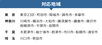 | 対応地域 | ・東京都 昭島市/あきる野市/足立区/荒川区/板橋区/稲城市/江戸川区/青梅市/江戸川区/青梅市/大田区/葛飾区/北区/清瀬市/国立市/江東区/小金井市/国分寺市/小平市/狛江市/品川区/渋谷区/新宿区/杉並区/墨田区/世田谷区/台東区/立川市/多摩市/中央区/調布市/千代田区/豊島区/中野区/奥多摩/西東京市/練馬区/八王子市/羽村市/東久留米市/東村山市/東大和市/日野市/府中市/福生市/文京区/町田市/三鷹市/港区/武蔵村山市/武蔵野市/目黒区 ・神奈川県 愛甲郡愛川町 愛甲郡清川村 足柄上郡大井町 足柄上郡開成町 足柄上郡中井町 足柄上郡松田町 足柄上郡山北町 足柄下郡箱根町 足柄下郡真鶴町 足柄下郡湯河原町 厚木市 綾瀬市 伊勢原市 海老名市 小田原市 鎌倉市 川崎市 川崎市麻生区 川崎市川崎区 川崎市幸区 川崎市高津区 川崎市多摩区 川崎市中原区 川崎市宮前区 高座郡寒川町 相模原市 相模原市中央区 相模原市緑区 相模原市南区 座間市 逗子市 茅ヶ崎市 中郡大磯町 中郡二宮町 秦野市 平塚市 藤沢市 三浦郡葉山町 三浦市 南足柄氏 大和市 横須賀市 横浜市 青葉区 旭区 泉区 磯子区 神奈川区 神奈川区 金沢区 港南区 港北区 栄区 瀬谷区 都筑区 鶴見区 戸塚区 中区 西区 保土ヶ谷区 緑区 南区 ・埼玉県 上尾市 朝霞市 入間郡越生町 三芳町 毛呂山町 入間市 大里郡寄居町 桶川市 春日部市 加須市 川口市 川越市 北足立郡伊奈町 北葛飾郡杉戸町 松伏町 北本市 行田市 久喜市 熊谷市 鴻巣市 越谷市 児玉郡上川町 上里町 美里町 幸手市 さいたま市岩槻区 浦和区 大宮区 北区 桜区 中央区 西区 緑区 南区 見沼区 坂戸市 狭山市 志木市 白岡市 草加市 秩父郡小鹿野町 長瀞町 秩父村 皆野町 横瀬町 秩父市 鶴ヶ島市 所沢市 戸田市 新座市 蓮田市 羽生市 飯能市 東松山市 比企郡小川町 川島町 ときがわ町 滑川町 鳩山町 吉見町 嵐山町 日高市 深谷市 富士見市 ふじみ野市 本庄市 三郷市 南埼玉郡宮代町 八潮市 吉川市 和光市 蕨市 ・千葉県 旭市 我孫子市 安房郡鋸南町 夷隅郡大多喜町 夷隅郡御宿町 いすみ市 市川市 市原市 印西市 印旛郡酒々井町 浦和市 大網白里市 柏市 勝浦市 香取郡神崎町 香取郡多古町 香取郡東庄町 香取市 鎌ケ谷市 鴨川市 木更津市 君津市 佐倉市 山武郡九十九里町 山武郡芝山町 山武郡横芝光町 山武市 白井市 匝瑳市 袖ケ浦市 館山市 千葉市 稲毛区 中央区 花見川区 緑区 美浜区 若葉区 銚子市 長生郡長柄町 白子町 長生村 長南町 長柄町 睦沢町 東金市 富里市 流山市 習志野市 成田市 野田市 富津市 船橋市 松戸市 南房総市 茂原市 八街市 八千代市 四街道市 |